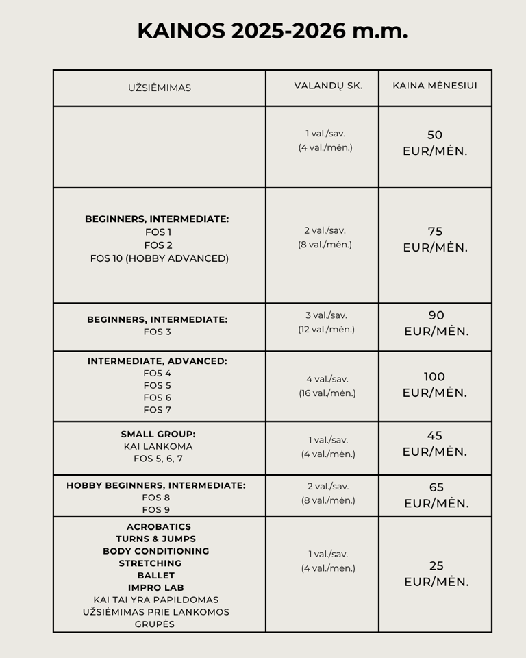 Pirma bandomoji pamoka nemokama (jei nusprendžiate lankyti – į abonementą įtraukiama pirmoji bandomoji pamoka).